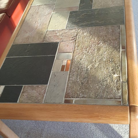Skulpturelt sofabord med bordplade i klinker, skifer, kobber og messing.