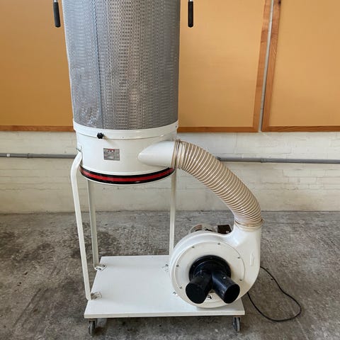 Miljøfilter 229/B industriel filterenhed monteret på en blå vogn med hjul. Enheden inkluderer et cylindrisk metalfilter med stofpose der kan tømmes og bruges igen og en filterboks med indsatsfilter, samt en kraftig motor. Designet til industriel brug, egnet til filtrering af slibestøv fra excentersliber.