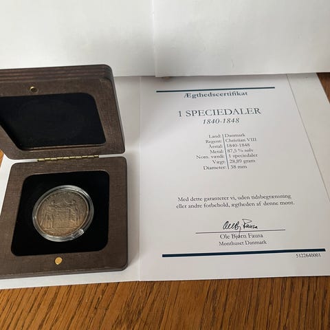 Danmark 1 Speciedaler 1840 sølvmønt med motiv af Christian VIII. Vægt: 28,893 gram, diameter: 37 mm. Mønten er udstedt i Danmark og har ægthedscertifikat.