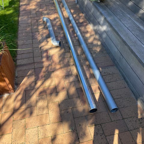 Ny zink-nedførsel med buk (75 mm) (fra Plastmo) til overgang mellem nedløbsrør og brøndkrave. Nypris ca. 500 kr.
