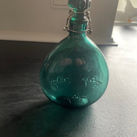 Flaske i klart glas med præget mærkning og porcelæn låg med metalbeslag.