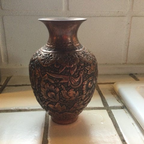 &Tradition Dekorationsornament Vase med to håndtag og en slank hals. Vasen har en rustik overflade med en kombination af orange, brun og grå farver. Materialet ser ud til at være keramik med et antikt, slidt udseende.