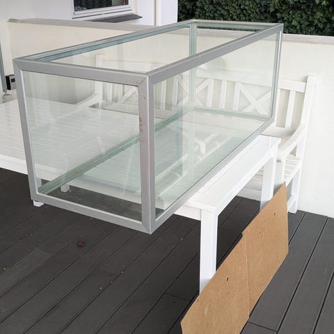 Terrarium med sort ramme og baggrund. Terrariet er fremstillet af glas og har låger med lås. Der følger en hjemmelavet fra baggrund samt en fastmonteret (kan nemt tages af) lampe. Brugt til skægagame.