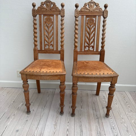 Sæt bestående af fire antikke træstole med udskårne rygstøtter og lædersæder. Stolene har dekorative nitter langs kanten af sædet og detaljeret træudskæring på ryggen. Materiale: træ og læder. Farve: naturlig træfinish og brun læder.