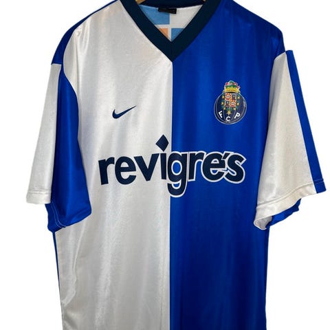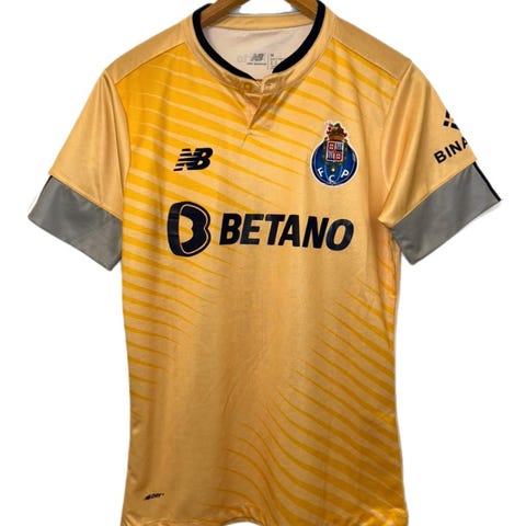 New Balance FC Porto fodboldtrøje udebanetrøje i guld med sorte detaljer, størrelse XS/122. Trøjen har teamlogo på brystet og er designet til fodboldbrug. Materialet er let og velegnet til sport.