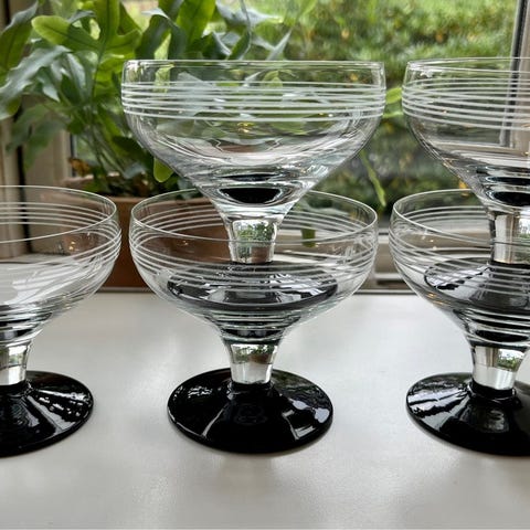 8 stk med sort fod og striber. Højde 8,6 cm. Bredde 9,4 cm. I pæn stand med lidt slitage, ingen glaspest