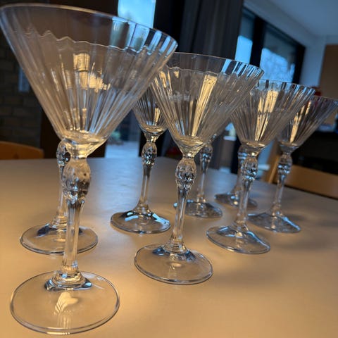 6 Unikke mundblæste samt håndskårne cocktailglas i krystal “Domino” by Peill & Putzler med det ætsede “P” i bunden.