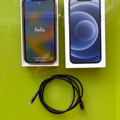 iPhone 12, 128 GB, tilbydes til DKK 1.900,-. Enheden er udstyret med en ny skærm, nyt panserglas, et nyt cover samt en ny oplader med adapter og ledning.