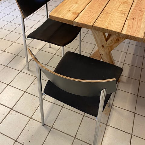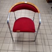 Stol fra Radius med armlæn og rød polstret sæde. Armlæn har brugsspor se billede