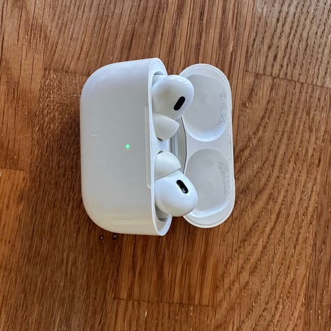 Apple AirPods Pro (2. Gen) trådløse høretelefoner i hvid med aktiv støjreduktion og justerbare silikoneørepuder. Inkluderer opladningsetui med beskyttelse og ekstra ørepuder i forskellige størrelser. Der sidder skum ørepuder på nu.