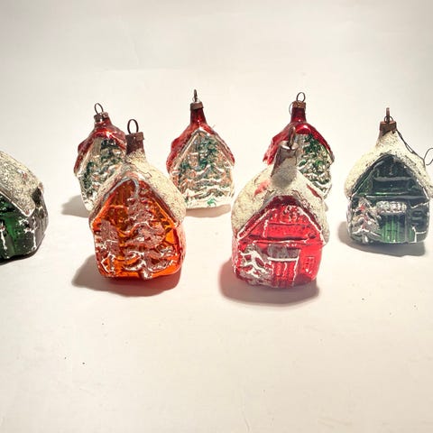 Gammelt glas julepynt - julehus, Gamle glas julekugler - jule hus. Den håndlavede julekugle er udført i mundblæst glas og er formet som et smukt julehus fyldt med de fineste detaljer på de fire sider. gamle julekugle er smukt forsølvet og håndmalet. Er så skønt og skævt og utroligt charmerende! Med ophæng til at hænge på juletræet.