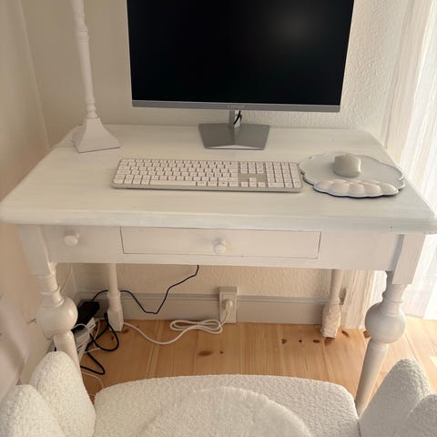 Fint gammelt skrivebord, med lille skuffe, elegante ben. Træ. Ben kan skrues af så det er let at transportere.