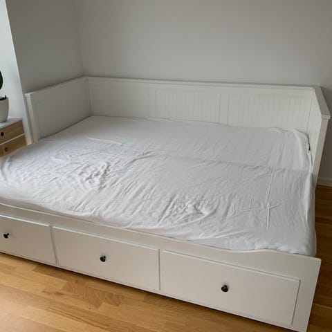 RESERVERET. Praktisk dagsseng der kan foldes ud som dobbeltseng. Ny pris 4200,- Tre store skuffer i front med greb