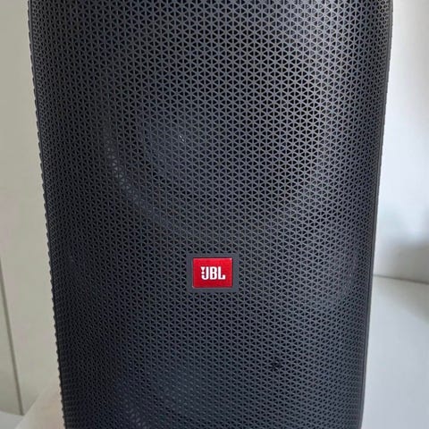 JBL PartyBox trådløs højttaler med indbygget lysfunktion. Designet til bærbar brug med trådløs tilslutning og kraftfuld lyd. Velegnet til fester og udendørs brug.
