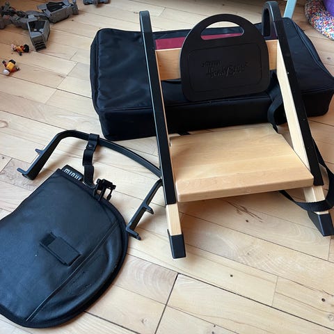 Kan fastgøres på stole med sele. Nem at have med på tur.