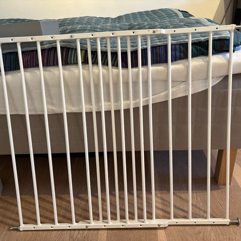 BabyDan børnegitter i metal. Designet til at skabe sikkerhed i hjemmet ved at forhindre børn i at få adgang til bestemte områder. Gitteret er hvidt og egnet til indendørs brug.
