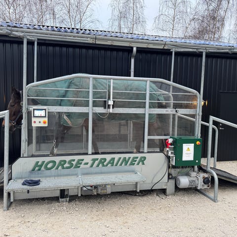 Båndet er også udstyret med “panik” sensor der stopper båndet omgående hvis hesten falder eller hopper for meget.