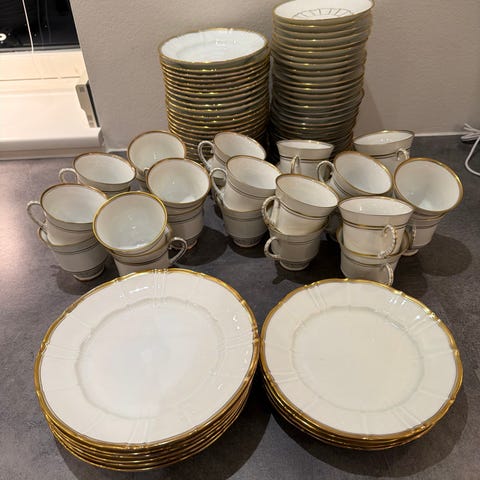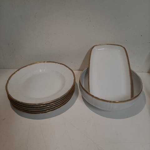 Bing & Grøndahl tallerken sæt med guldkant. Sættet består af flere tallerkener i porcelæn med dekorativ guldkant. Velegnet til servering af mad ved formelle eller daglige måltider.