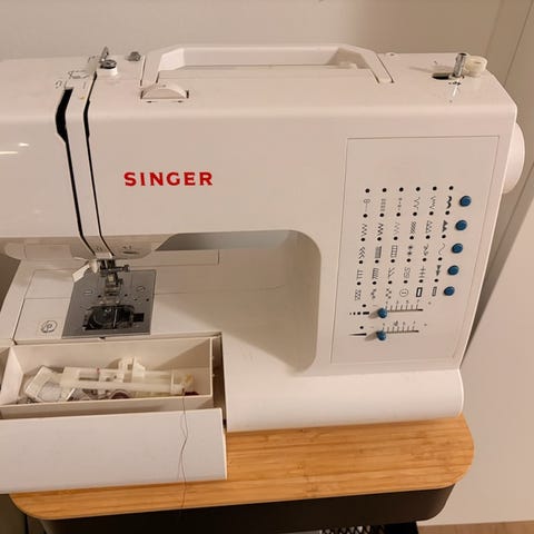 Singer Inspiration symaskine med fodpedal. Modellen er 4210, fremstillet i hvid plast. Maskinen er egnet til almindelig syning og har flere funktioner til forskellige sømme.