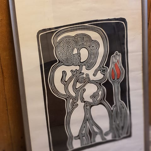 Litografi, I.He (I.Helbl, Horsens?), motiv: Pige i grønne omgivelser, lidt abstrakt, b: 70 h: 67,5, Fantastisk smukt litografi i dejlige farver og orig. signeret IHe/2011. - I smuk hvid metalramme med refleksfrit glas - som nyt - skal afhentes p.g.a. glas og vægt - er nedsat til mindsteprisen = under rammens pris