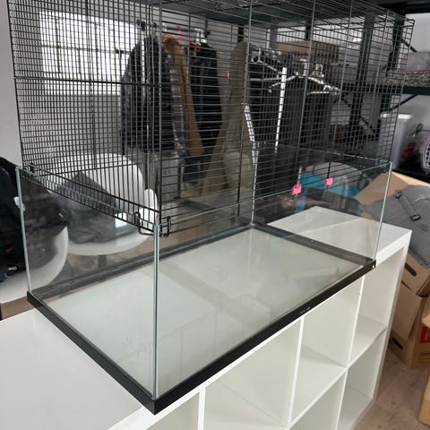 Stort flot bur med soverum der kan åbnes. Er lavet af Akrylplader og mdf-plader