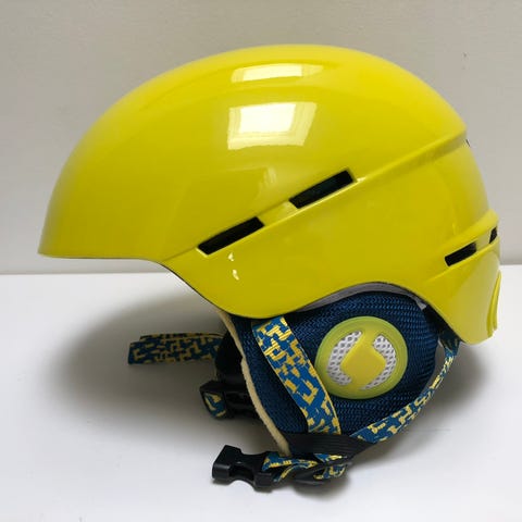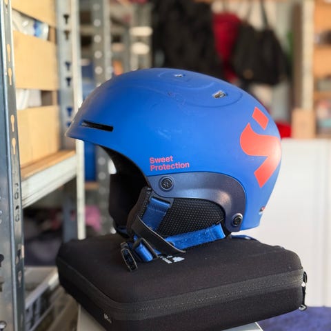 Flot blå hjelm som er til at få øje på ude på pisten.