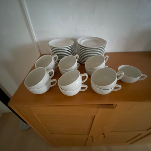 Smukt kaffestel fra Royal Copenhagen i lysegrøn med fin guldkant. Sættet består af 7 kopper, 7 underkopper og 7 kagetallerkener (21 dele i alt). Alle dele er i perfekt stand uden skår eller revner. 1. sortering.