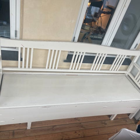 Hvid slagbænk i massiv træ med udtræk og flotte udskæringer. God opbevaring under sæde.