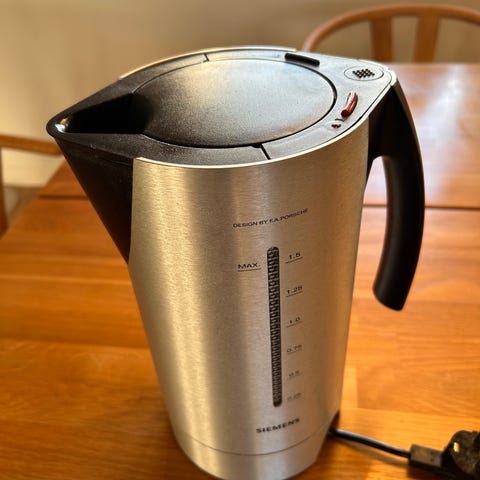 Siemens elkedel i Porsche Design-serien, model TW911P2. Elegant elkedel i rustfrit stål. Den har en kapacitet på 1,5 liter.