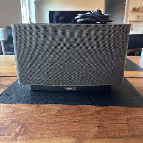 Sonos Play:5 trådløs højttaler i hvid farve. Enhed til trådløs lydafspilning med flere tilslutningsmuligheder inklusive Ethernet-port. Designet til brug i hjemmet til afspilning af musik og lydindhold.