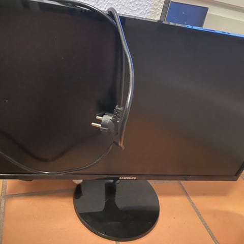 24 tommer skærm med rund sort fod. Skærmen er velegnet til generel brug og tilsluttes via strøm kabel og HDMI. Det er en 60 hz skærm