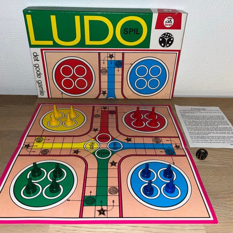 Super flot Ludo-spil. Alle brikker er der, og der er spilleregler i låget. Selve spillet er i perfekt stand, men låget er blevet repareret med lidt tape - se billeder.