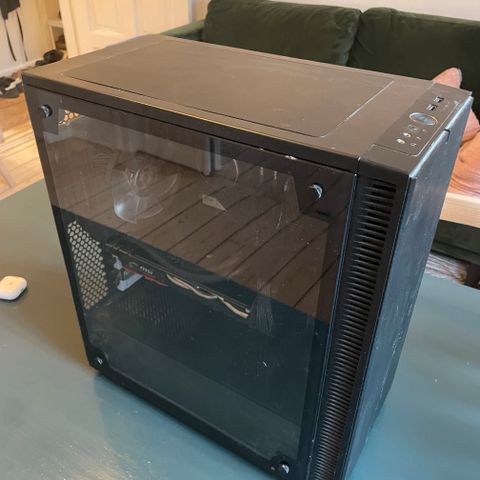 Lenovo stationær computer. Sort kabinet med frontpanelets porte og ventilation. Velegnet til generel brug.