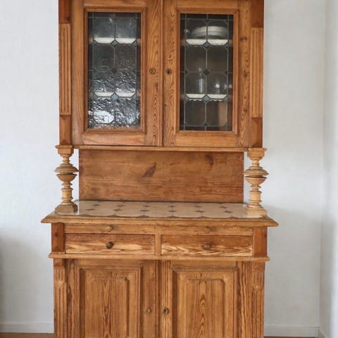 Antik fyrretræ vitrineskab med glaslåger og skuffer. Fremstår i rigtig pæn stand.