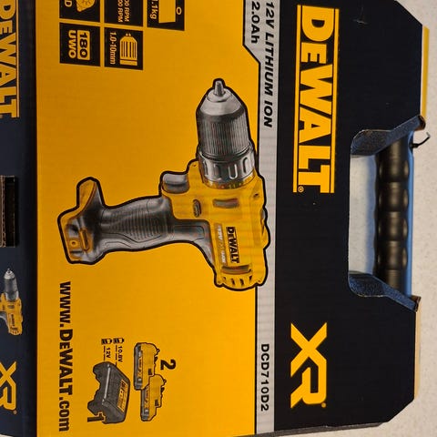 DeWalt XR boremaskine med batteri og oplader. Maskinen er ledningsfri med genopladeligt batteri, velegnet til bore- og slagboringsopgaver. Farven er gul og sort, og den er designet til alsidig brug.