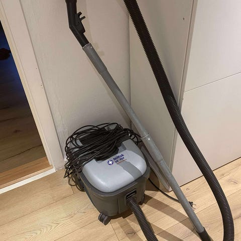 Nilfisk støvsuger med rund beholder, udstyret med en orange ledning og fleksibel slange. Velegnet til rengøring i hjemmet eller på kontoret.