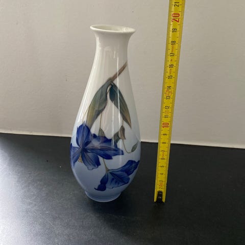 Royal Copenhagen vase med blå landskabsmotiv. Vasen er dekoreret med maritime og naturinspirerede motiver i blå nuancer. Den er fremstillet i porcelæn og har en rund form med en smal åbning. Vasen kan anvendes som dekorativ genstand eller til opbevaring af blomster.