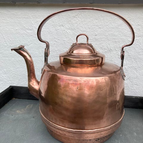 Der findes mange små kobberkedler på markedet; denne skiller sig markant ud i både størrelse, vægt og udførelse. Det er et stykke ældre brugshåndværk, sandsynligvis skandinavisk (dansk/nordtysk), hvor kvaliteten taler for sig selv.