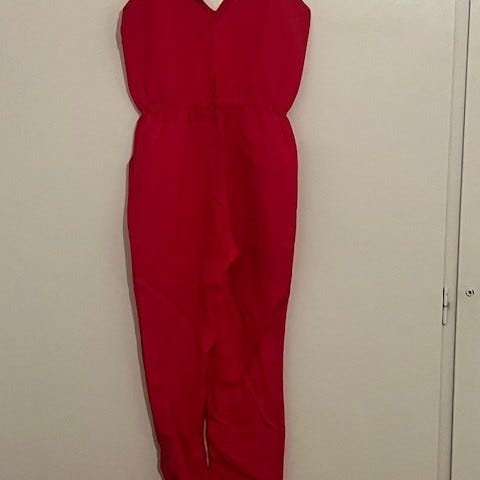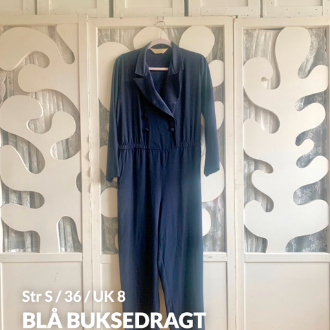 Kongeblå buksedragt af tykt stof, med 3/4 ærmer og bælte i taljen. Egnet til nytår eller en anden kølig og/eller festlig aften.
