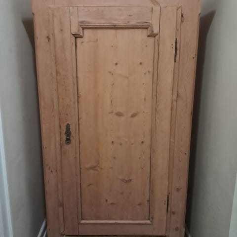 Karlekammerskab i afsyret fyr. Solidt og velholdt med flot, lys overflade. Praktisk indretning med bøjlestang og mulighed for hylder . Klassisk, tidløst design – passer perfekt til soveværelse, stue, entré eller sommerhus.