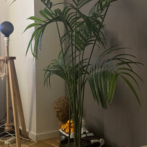 Kunstig palme med en højde på 180 cm placeret i en sort potte. Fremstillet af materialer, der efterligner ægte palmeblade og stamme. Velegnet til indendørs brug som dekorativ plante.