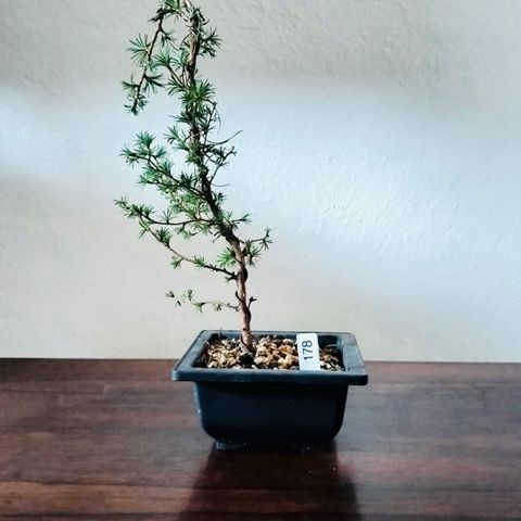 Kunstigt Bonsai træ med snoet stamme og grønne nåleagtige blade, plantet i en sort firkantet potte. Velegnet til indendørs dekoration.
