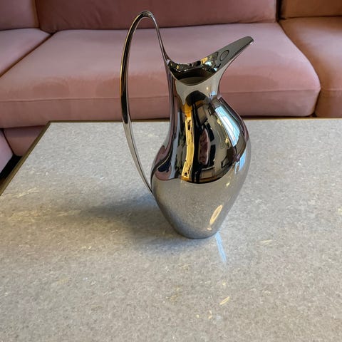 Georg Jensen kande fremstillet i blankpoleret rustfrit stål. Designet af Henning Koppel. Kanden er en firmajulegave og har aldrig været ude af æsken. Pris i butikkerne: 1.599,- kr.