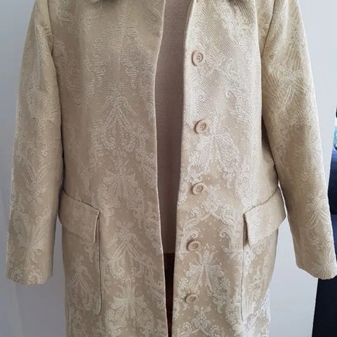 Frakke, str. 46, Studio Denmark, Tiger gul/brun, 100% polyester, Næsten som ny, Sommerfrakke størrelse 46-48 med bælte, fremstår som ny. (694)