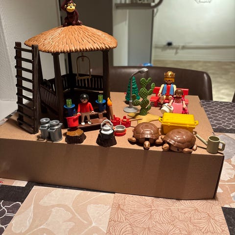 Playmobil legetøjsvandland med pool, liggestole, parasol og figurer.