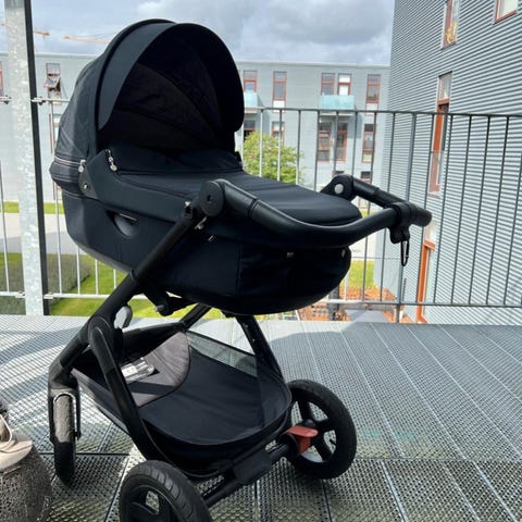 Stokke Trailz barnevogn og klapvogn i god stand. Begge dele er i grå. Barnevognen har 4 x punkterfrie dæk. Der medfølger parasol og regnslag.