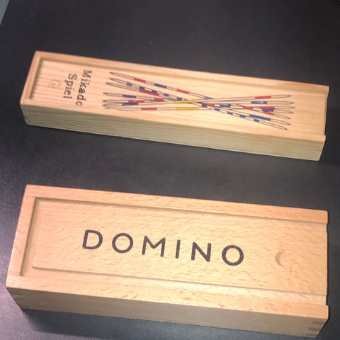 Sæt bestående af Fruit Dominoes og spisepinde lavet i træ. Dominoerne har frugtillustrationer, og spisepindene er almindelige træpinde. Sættet kan bruges til spil og læring.