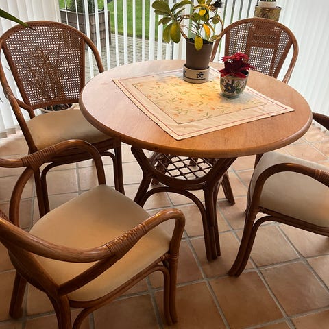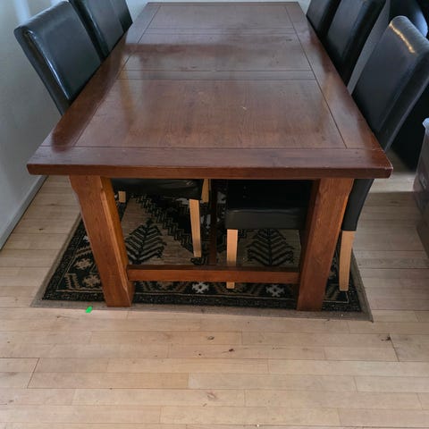 Spisebordssæt med 4 stole. 2 bordplader høre med. Det er et smukt antik spisebordssæt. Både stole og bord, har synlige mærker og ridser, men dette tilføjer blot noget ekstra til charmen. Det sælges alt sammen samlet for 400kr + at man selv skal sørge for afhentning. Dette er et hastesalg og skal helst kunne afhentes inden d. 6. Januar.