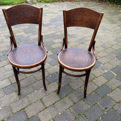 Ældre Thonet Bentwood stole med flet sæde. Sættet består af 4 stole med buede rygstøtter og flettede sæder. Stolene har en klassisk bentwood konstruktion og er velegnede til brug i spisestue eller cafémiljø.