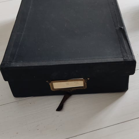 Vinted “arkiv”-kasse i god stand, ingen huller i, men naturligvis patina, da kassen er af ældre dato. Fungerer fint til opbevaring. Kassen er i noget meget kraftigt paplignende materiale